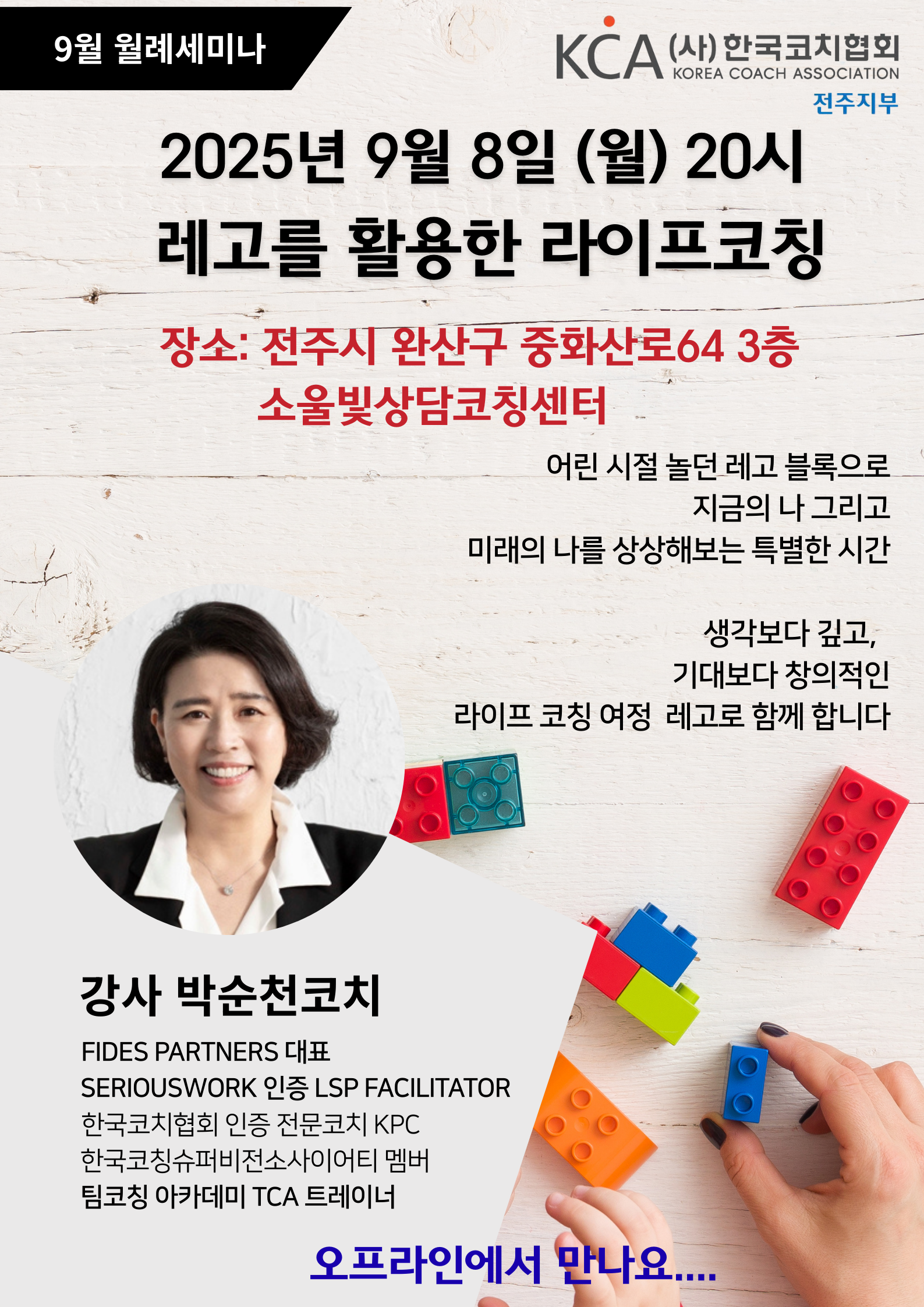 한국코치협회 전주지부의 초청을 받아 오프라인으로 진행하는 레고활용 라이프코칭 세션을 진행합니다.